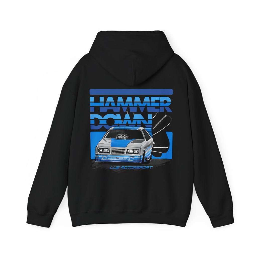 You could find these amazing Fox Body Race Cars going wheels up at 1980's NHRA events every weekend! With a fiberglass funny car body to match the 1984 Street Car, teams like Blue Max Racing repped the blue oval one 1/4 mile at a time and left everything in their dust! Give your friends the rare chance to see the front of this Fox Body's chutes and put the Hammer Down in your new drag racing inspired Hoodie!